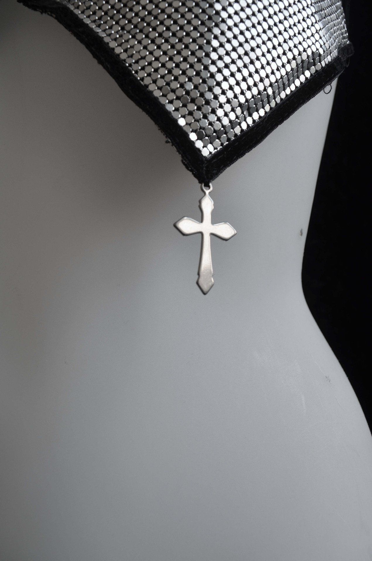 Le top se pare de pendentifs croix gothique, détail symbolique qui souligne la puissance mystique de la pièce.