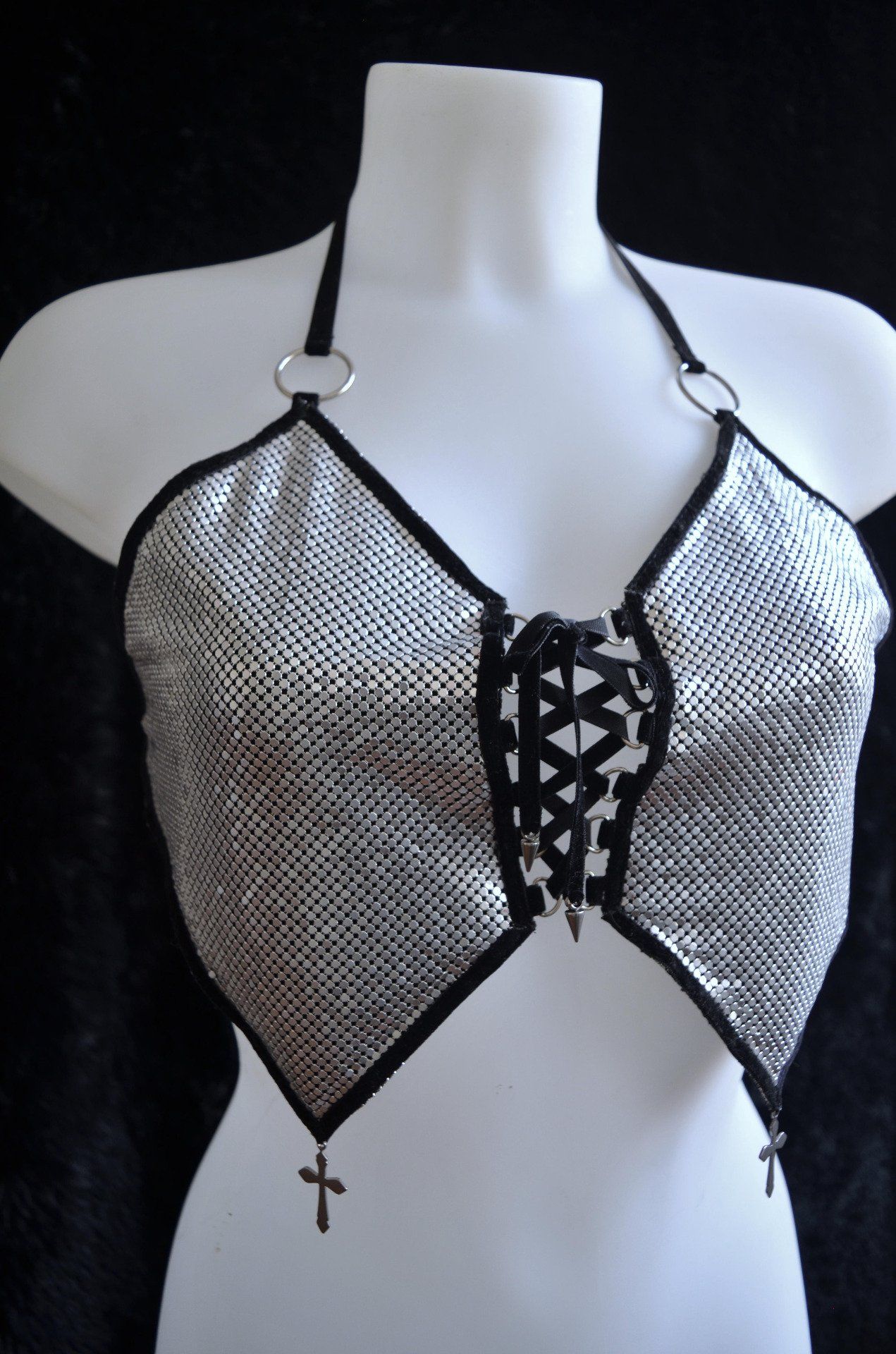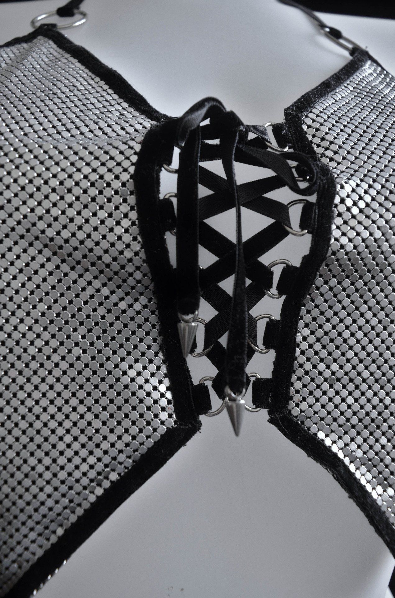 Réalisé en tissu métallique façon côte de maille, il évoque les reflets de l’acier et la grâce d’une guerrière médiévale. A l'avant un superbe laçage en velours noir, rapelle les corset d'époque, orné de breloques spikes en acier inoxydable.
