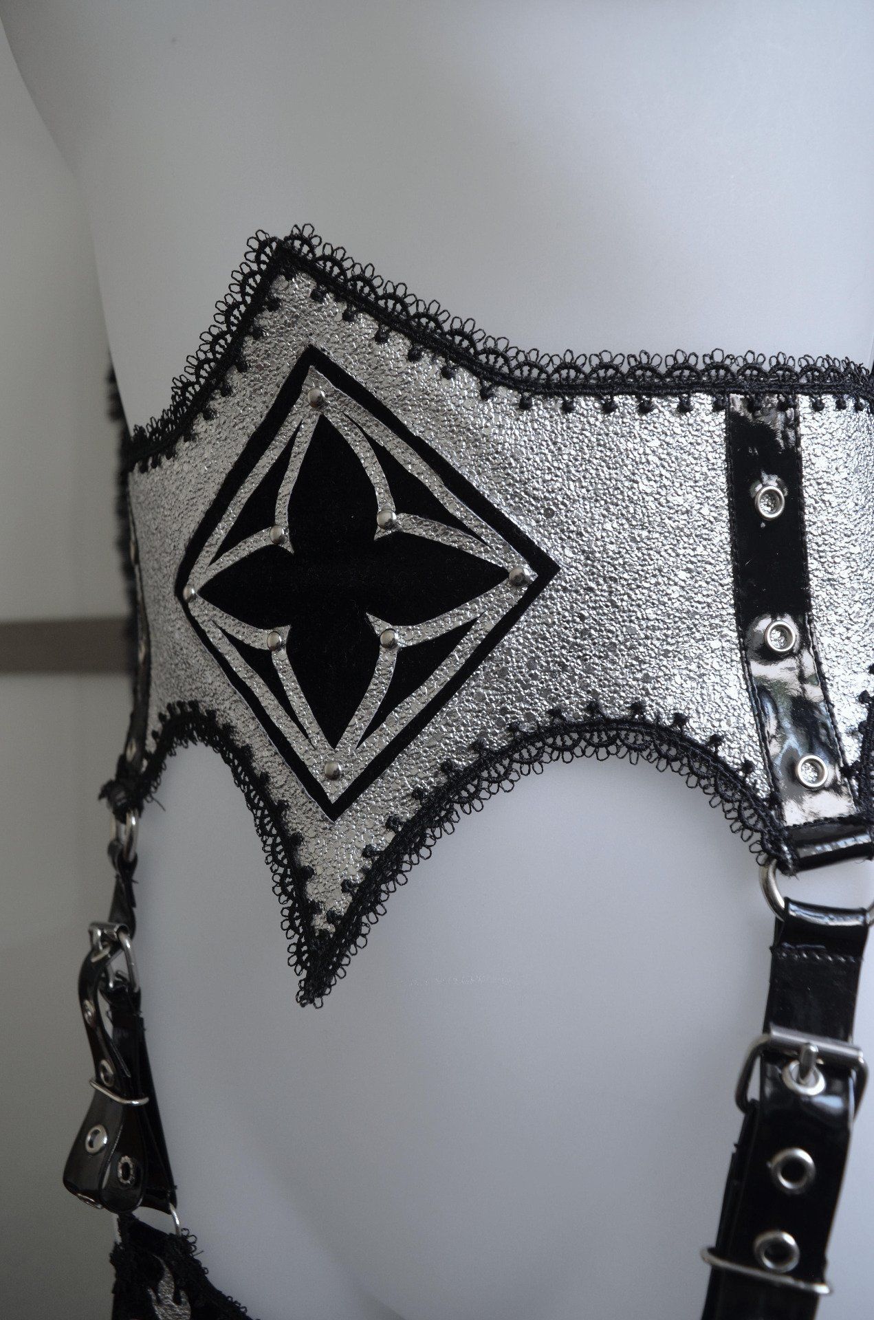 Set “Amor Armor” – Choker & Harnais porte-jarretelles en simili argenté et velours – Création unique faite main