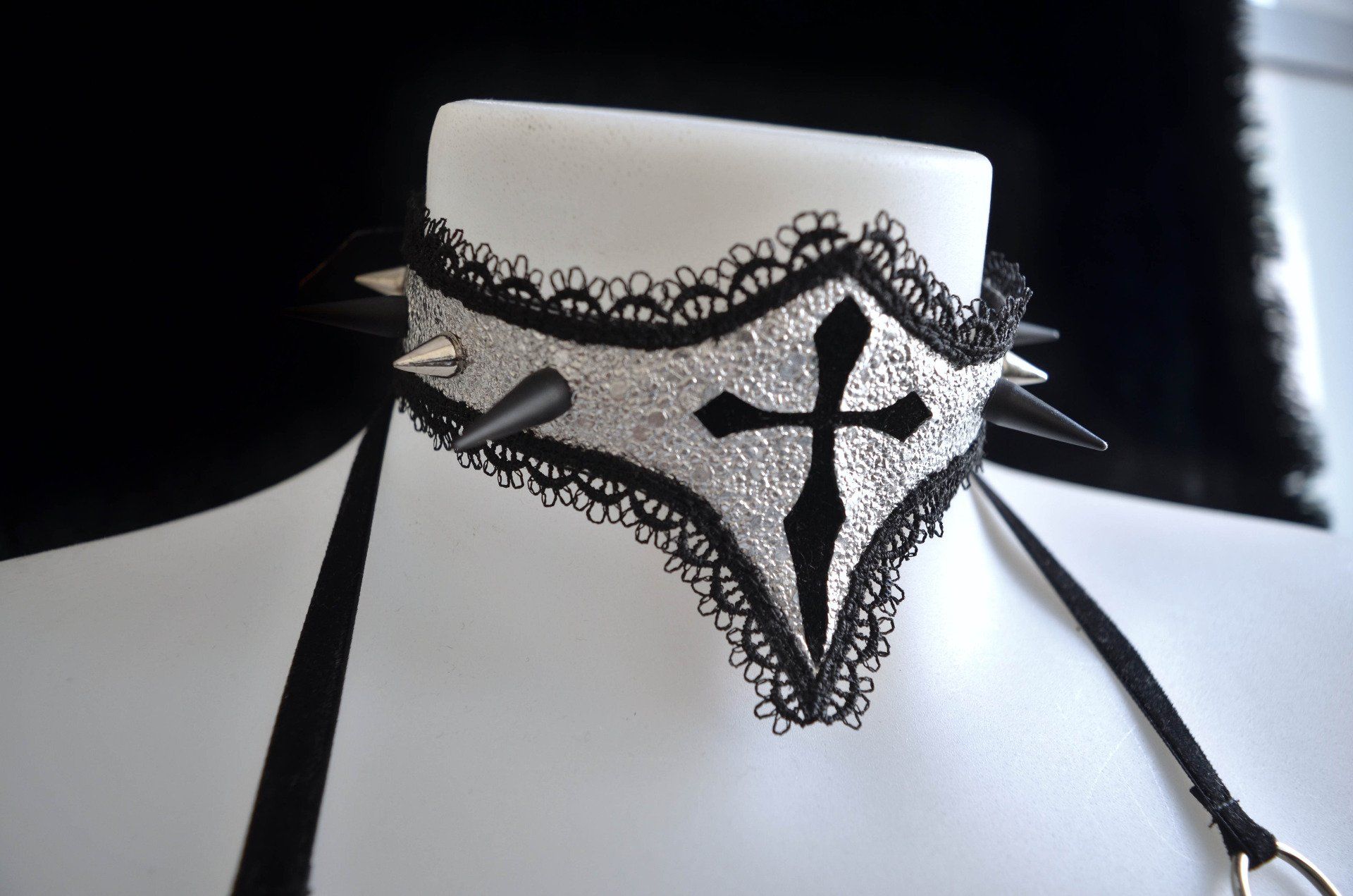 Le choker, réalisé en simili cuir argenté brillant, capte la lumière telle une parure d’acier. En son centre se dresse une croix en velours noir, découpée à la main, symbole d’élégance et de mysticisme.
