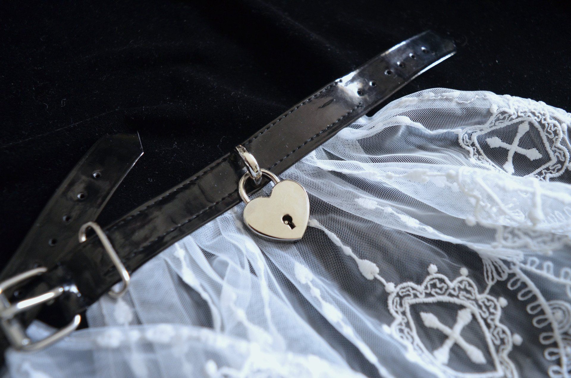 Réalisés en simili-cuir verni, ces bracelets épousent le poignet avec caractère et raffinement. Une dentelle blanche brodée de croix descend délicatement sur les mains, créant un contraste saisissant entre pureté et esthétique gothique.